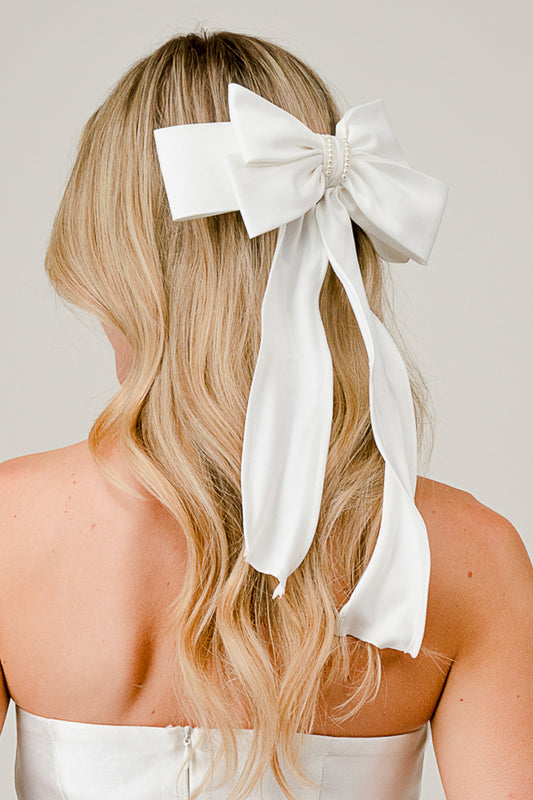 White Satin Bow Hair Clip with Pearl Accent